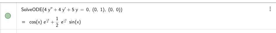 Jag skrev in exakt "SolveODE(4 y''+4 y'+5 y=0,(0,1),(0,0))" och det fungerar. Testa kopiera och klistra in exakt det jag skrev.