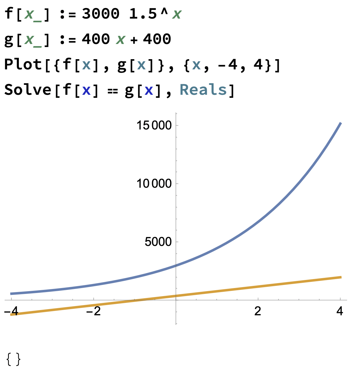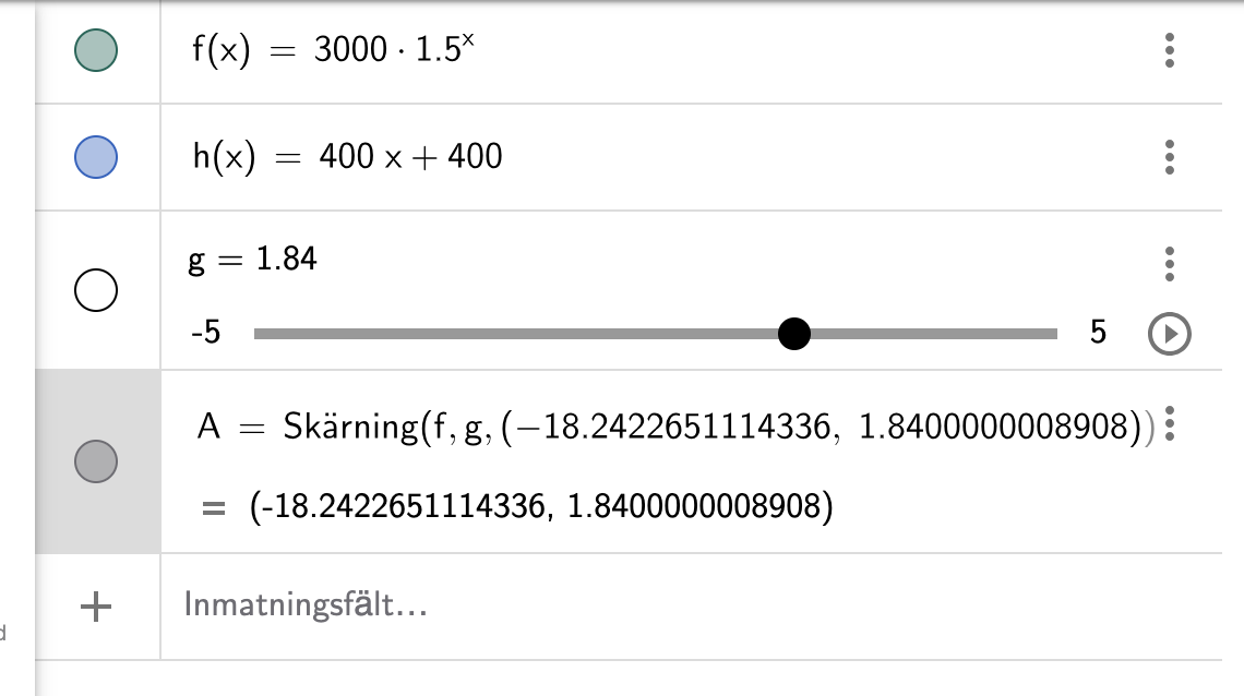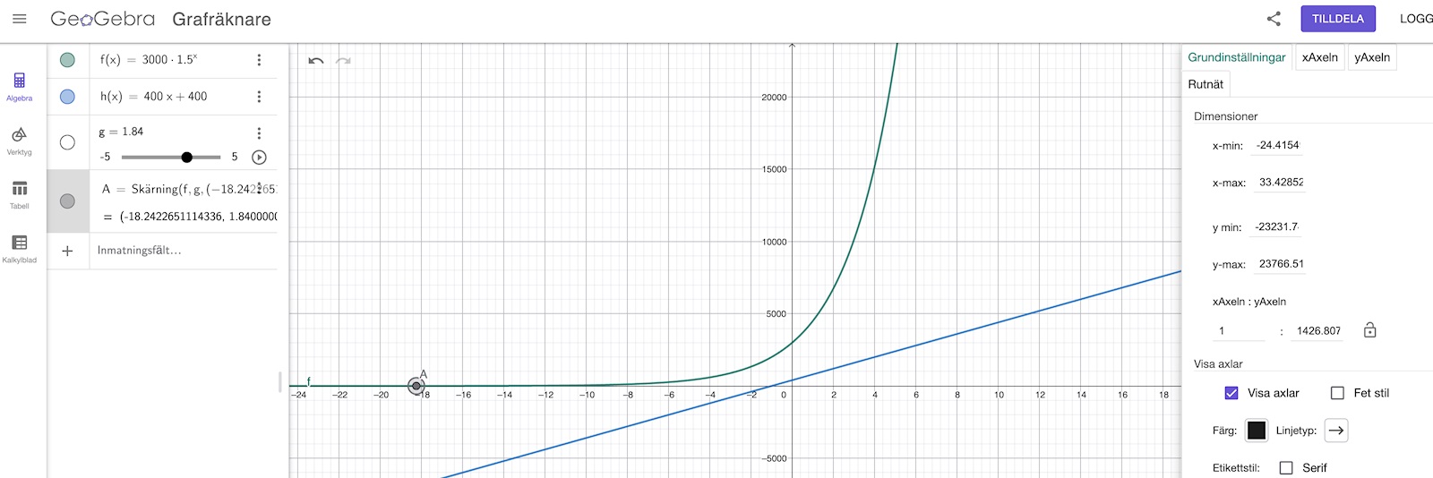 Hej! Jag har försökt lägga in funktionerna f(x)=3000•1,5^x och h(x)=400x+400. Funktionerna ska möta varandra vid en punkt, men det gör aldrig det och ena strecket blir helt rakt och det andra hamnar på fel sida av x axeln. Hjälp hur gör man? Det vill säga i geogebra.