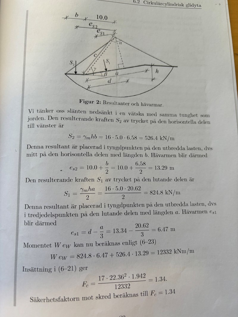 S1 är placerad "I tyngdpunkten på den utbredda lasten, dvs i tredjedelspunkten" står det i frågan. Som figuren är ritad ser det ut som att det är samma som d/2. Men det gäller inte för alla lutningar, beta. I min figur där jag har ritat en brantare slänt anar man att hävarmen inte är d/2 (inte a/3 heller som du var inne på tidigare).