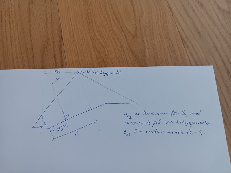 klart jag vet vad det vinkelräta avståndet betyder, om jag säger till dig att jag förstår es2 förstår du väl att jag förstår vad hävarmen är. Men fortfarande har ingen hjälpt mig att förstå varför hävarmen för s1 alltså es1 är d-a/3 och inte a/3. Varför har vi d med i beräkningarna över huvud taget?