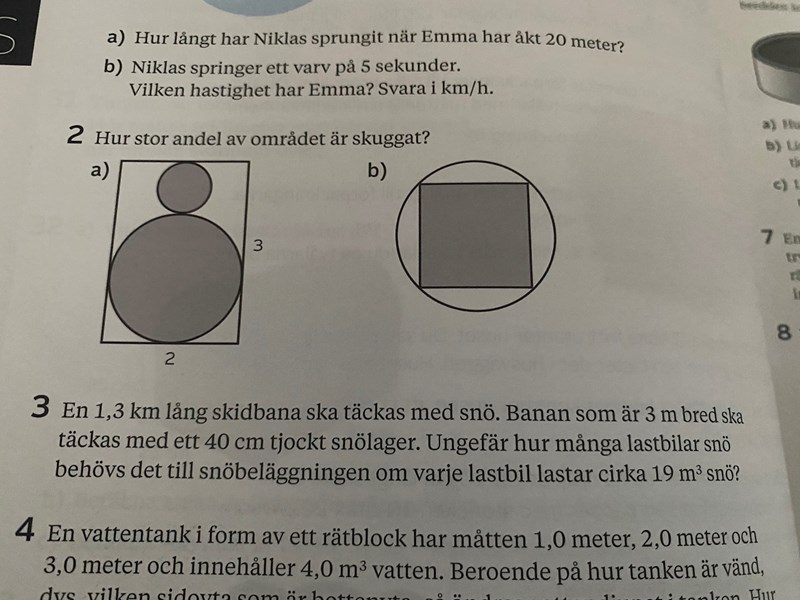 b) Diagonalen i kvadraten (vilket vi utgår från att det är, annars blir uppgiften omöjlig) är diameter i cirkeln. Du får anta en diameter x och räkna med det. x försvinner emot slutet då du beräknar andelen.
