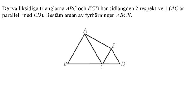 - Triangeln AEC, en vinkel är lätt att beräkna i den,(ACE =60 grader) kan du bevisa att de andr två vinklarna är 30 resp 90 grader så är det lätt att komma i mål