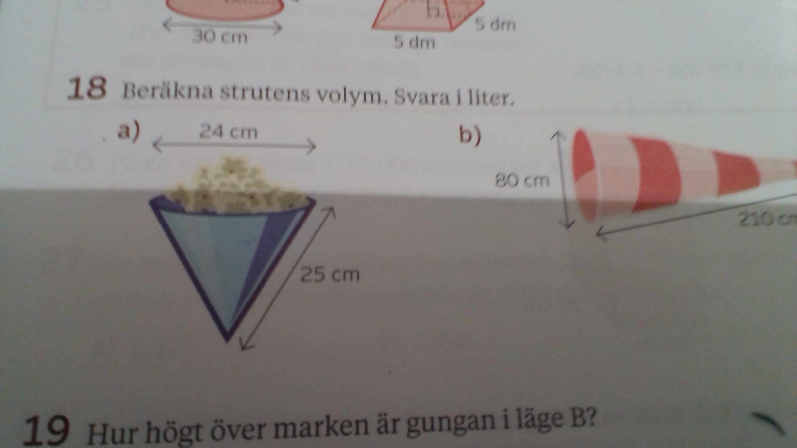 Förlåt för lite suddig bild, men jag behöver hjälp med uppgift 18a. Jag börja med att använda mig av pythagoras sats för att ta reda på höjden. 24 2 + X2 = 25 2. Svaret av det blir 7. 3,14 *12*7/3=87.92 sen vet jag inte vad jag ska göra eftersom det är i cm3 men de vill ha i volym.