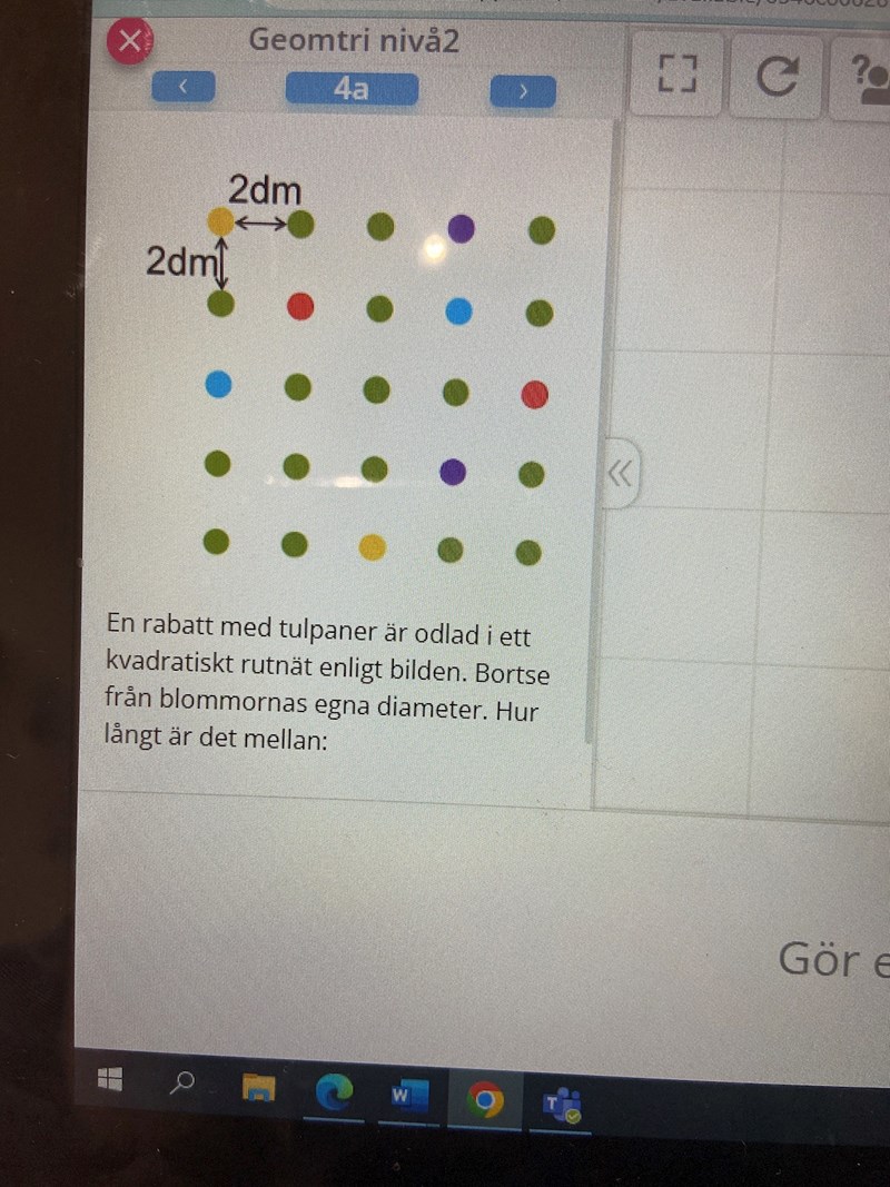 Du bör titta på hur många 2dm-avstånd i uppåtgående led som skiljer de två tulpanerna åt samt hur många 2dm-avstånd i sidåtgående led som skiljer de två tulpanerna åt. Därefter kan du använda Pythagoras sats, eftersom att man kan se fågelavståndet som hypotenusan i en triangel.
