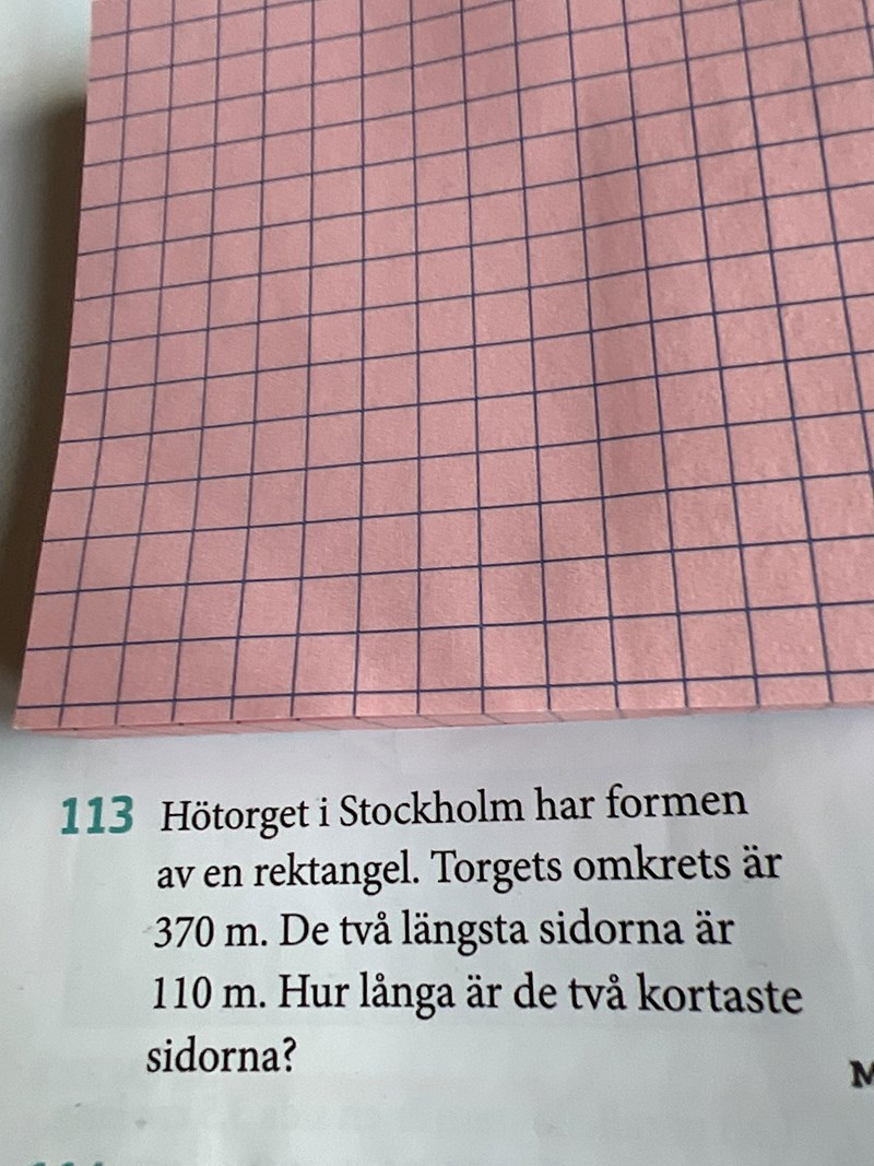 Fast jag skulle ha satt de korta sidornas längd till x och får då 2x+220 = 370    men det funkar ju som du gör också men då uppstår risken att glömma att dela med två på slutet.