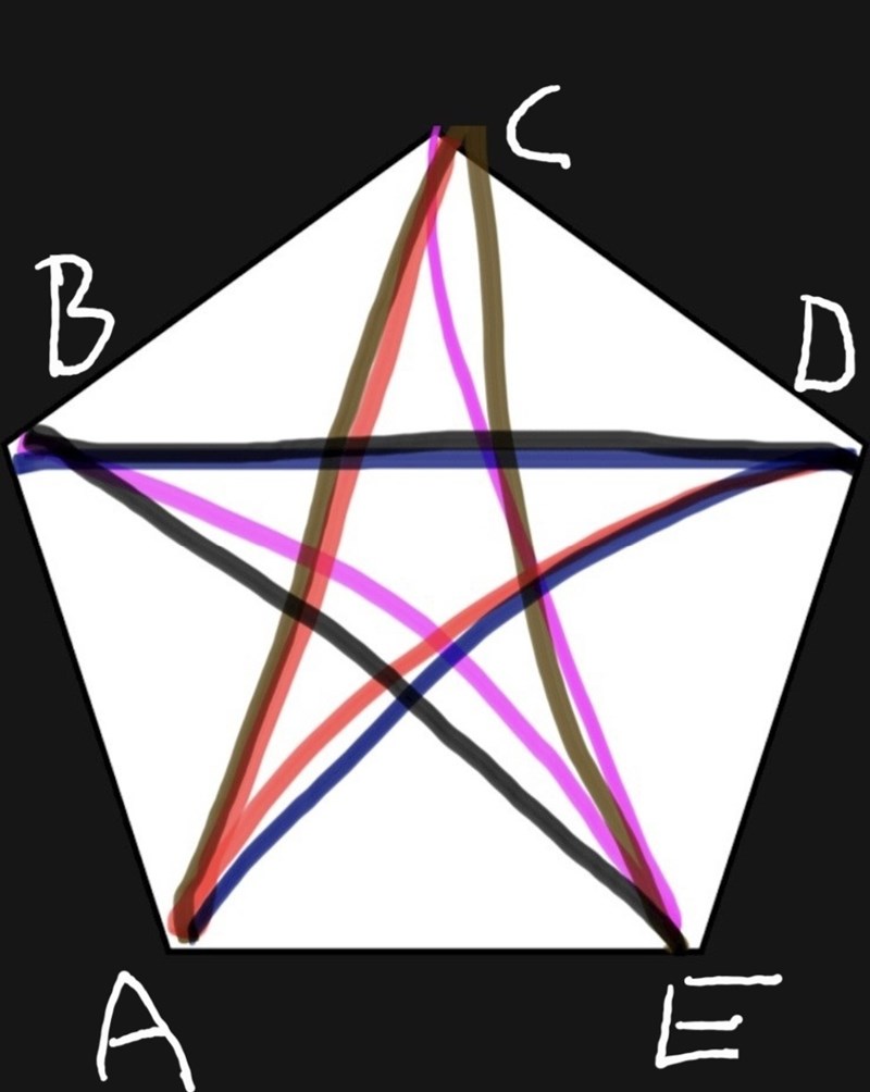 Börja alltså med att ta reda på hur många sätt det går att dra två diagonaler i en femhörning.