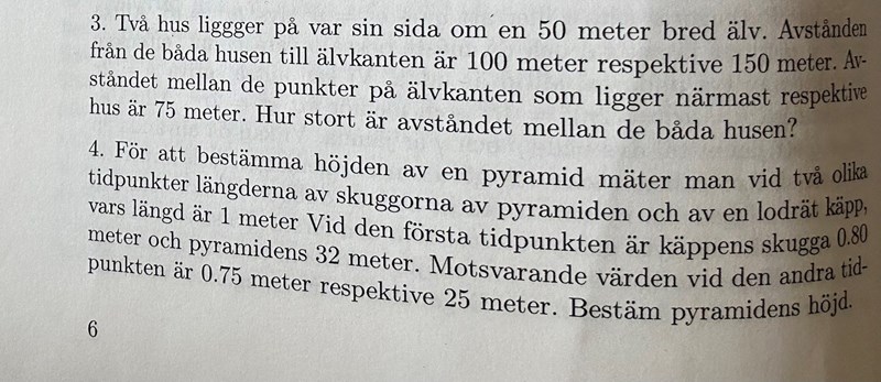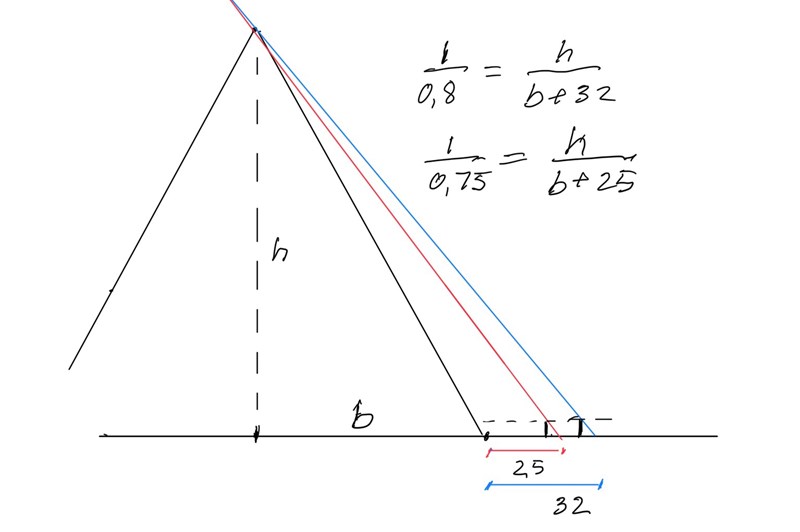 För att bestämma höjden av en pyramid mäter man vid två olika tidpunkter längderna av skuggorna av pyramiden och av en lodrät käpp, vars längd är 1 m. Vid den första tidpunkten är käppens skugga 0,8 m och pyramidens 32 m. Motsvarande värden vid den andra tidpunkten är 0,75 m respektive 25 m. Bestäm pyramidens höjd.