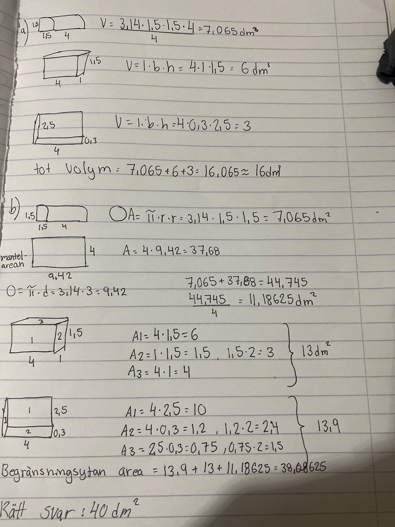 Här är en bild på min lösning men på a har jag rätt svar men på b så får jag fel svar det ska var 40dm2