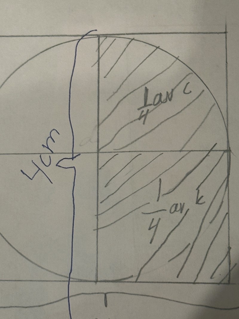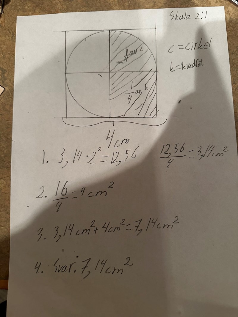 Oj skrev fel. Så du addera kvadratens area vilket är 16 cm2 med cirkelns och sedan subtraherade du areoerna med varandra och varför dividerade du cirkelns are med 2? Var det för att den lila färgen täcker halva av cirkeln.