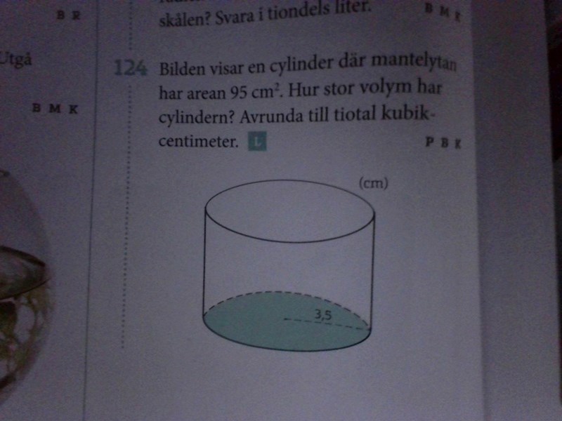 Jag vet att mantelytan är 95 cm2. För att räkna volym på cylinder ska jag V= Bxh