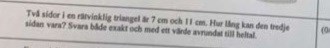 Jag vill ha hjälp då jag inte fattar något, har prov imorgon, hjälp snälla. uppgiften säger: två sidor i en rätvinklig triangel är 7cm och 11cm. hur lång kan den tredje sidan vara? svara både exakt och med ett värde avrundat till heltal.