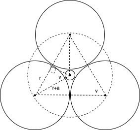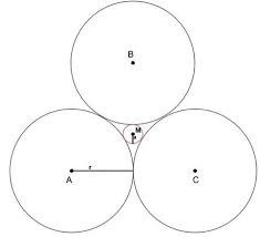 Tre cirklar med radie r tangerar varandra, där punkterna A, B och C är mittpunkter för respektive cirkel. En mindre cirkel med medelpunkten M och radie a bildas så att den tangerar de tre större cirklarna. Bestäm det exakta förhållandet mellan radien r och radien.