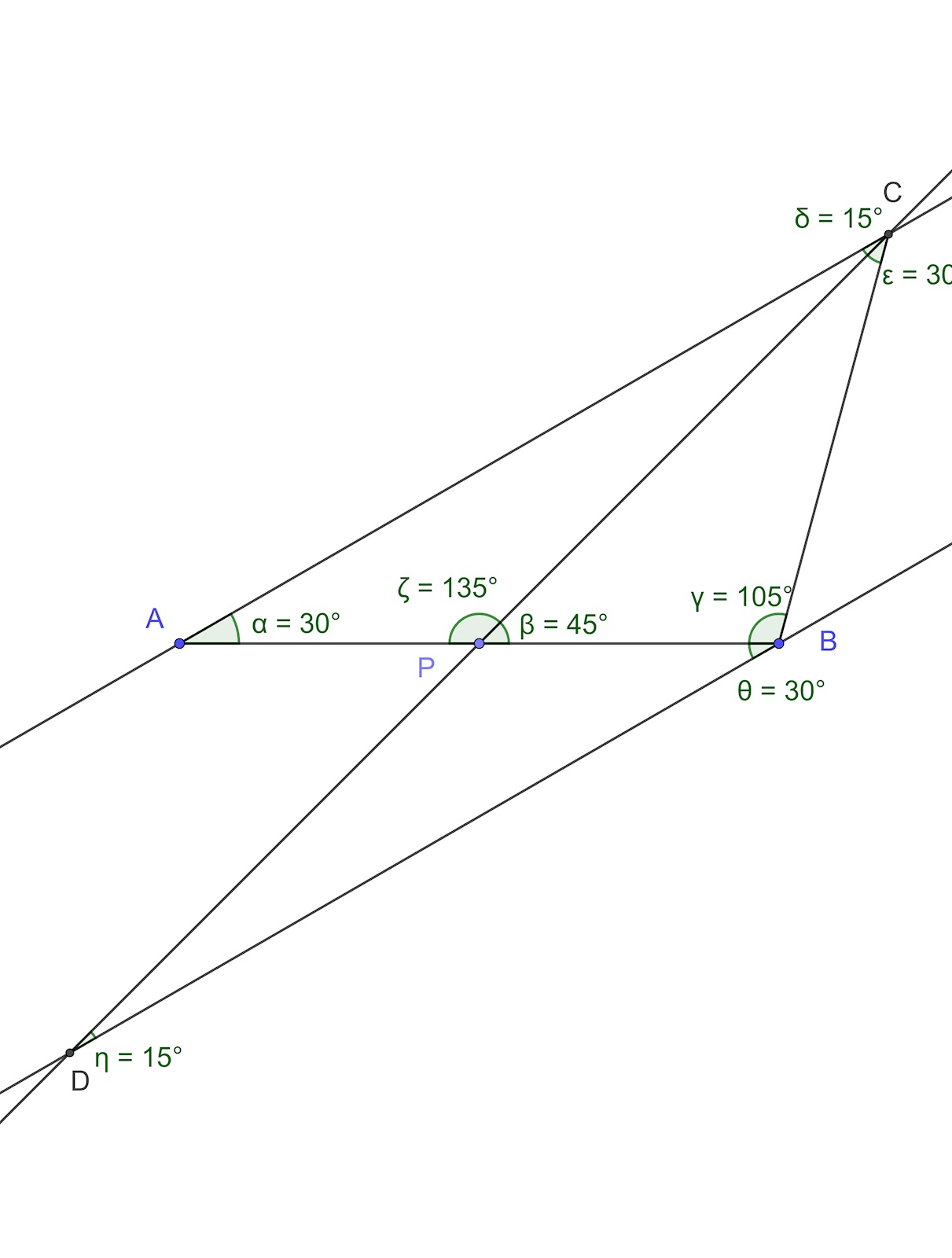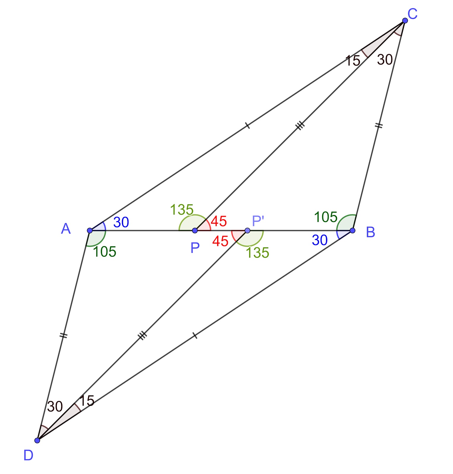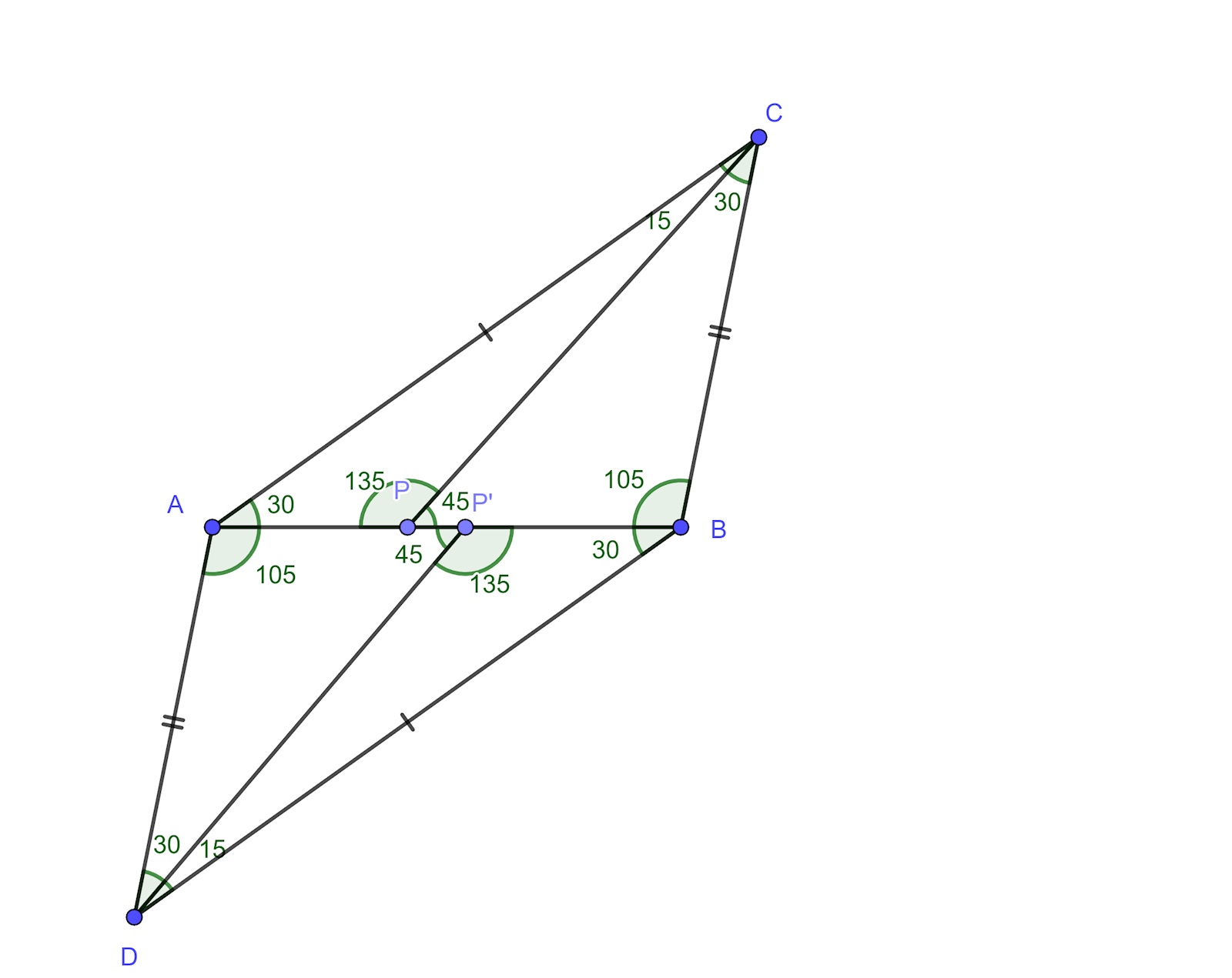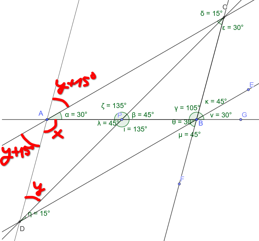 AC är parallell med BD och AB är en transversal. CAB=PBD=30o \angle CAB = \angle PBD = 30^o. Samma resonemang gäller för ACP=PDB=15o \angle ACP = \angle PDB = 15^o. \agnleAPC=DPB \agnle APC = \angle DPB (vertikalvinklar).