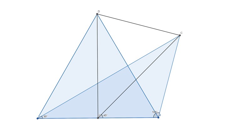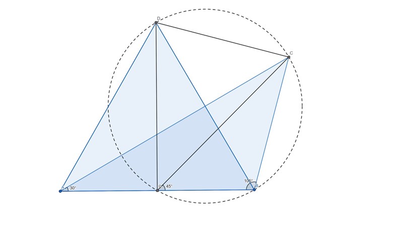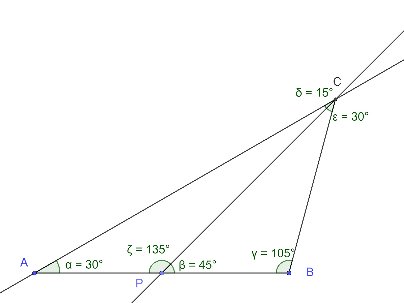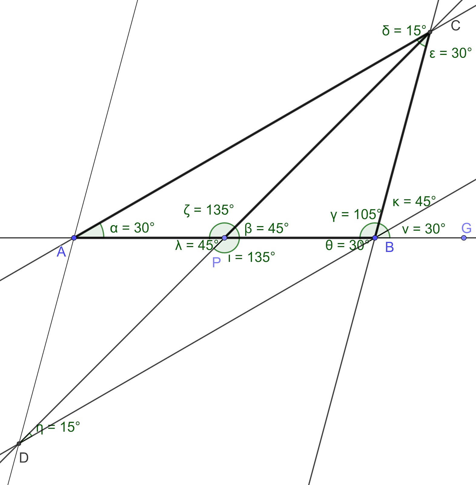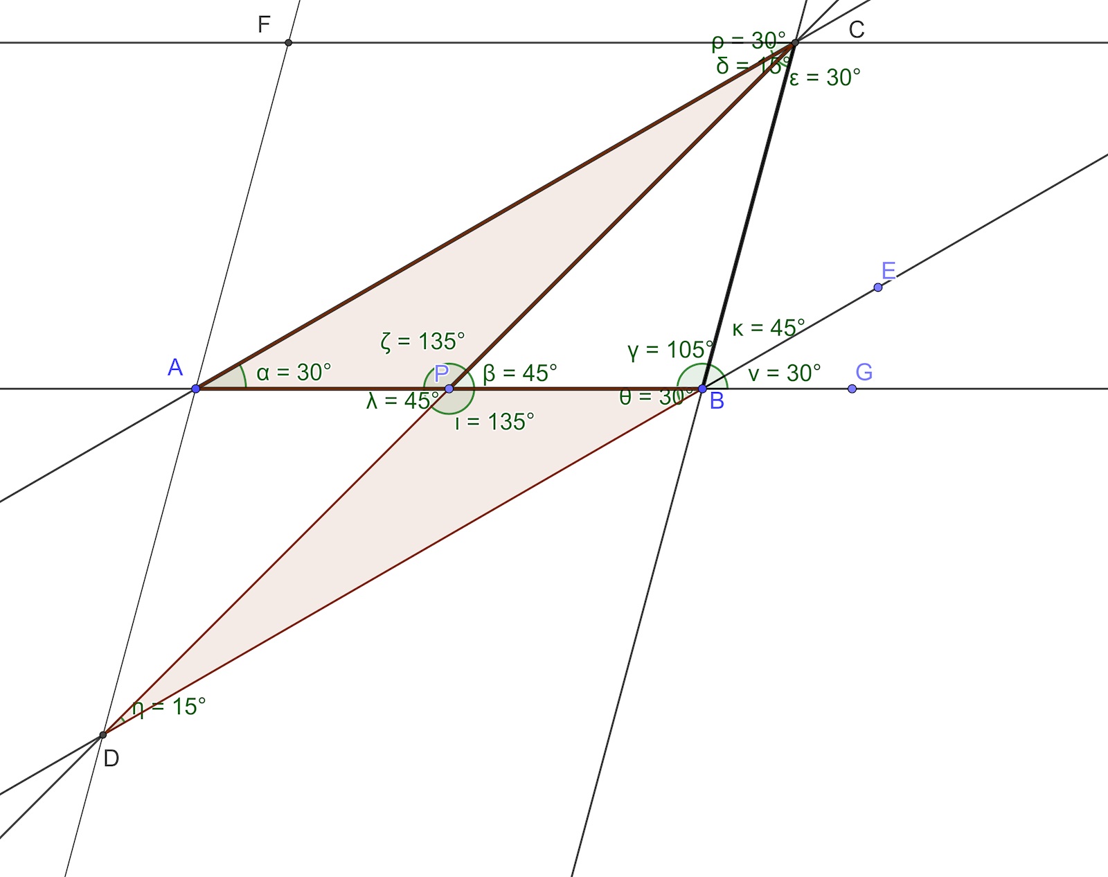 AC är parallell med BD och AB är en transversal. CAB=PBD=30o \angle CAB = \angle PBD = 30^o. Samma resonemang gäller för ACP=PDB=15o \angle ACP = \angle PDB = 15^o. \agnleAPC=DPB \agnle APC = \angle DPB (vertikalvinklar).