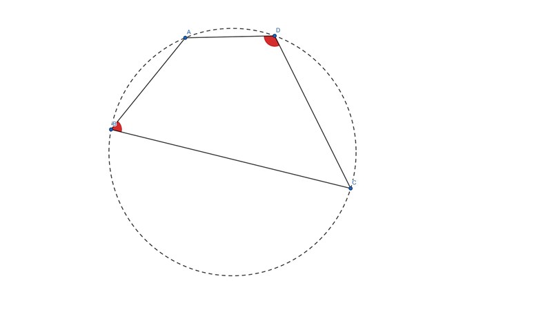 • En konvex fyrhörning ABCDABCD är cyklisk om och endast om ABC+CDA=180°\angle ABC + \angle CDA=180^{\circ} (dvs. summan av motstående vinklar är lika med 180°180^{\circ}).