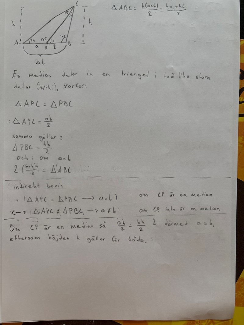 Har det med vinklarna 135 och 135 att göra? 135*2 + 45*2=360. Om vi drar parallella linjer till AB hade vi kunnat visa detta. Bilden du ritat med alla vinklar visar en motsägelse, medianen ska ju fortsätta genom triangel ADB i samma punkt som P respektive P'