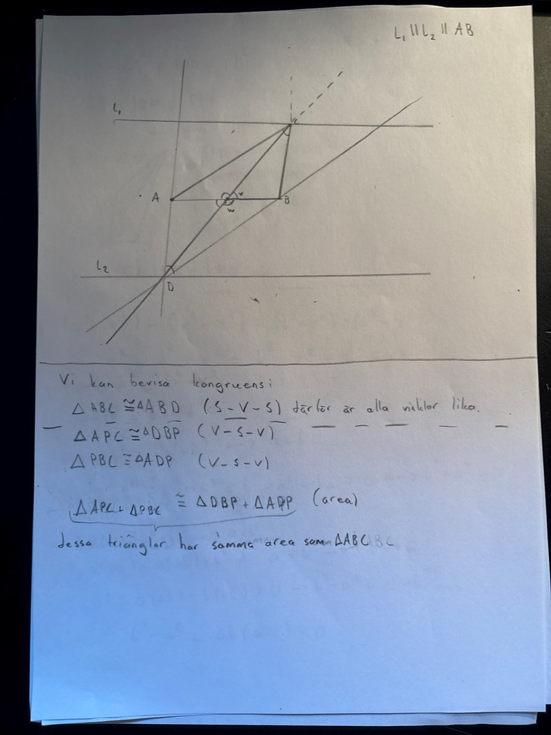 DC är en transversal till linjerna AD och BC. Eftersom och ∠ADP=∠PCB är linjerna AD och BC parallella. Det medför att ACBD är en parallellogram per definition. Då är AC=BD. Eftersom trianglarna APC och BPD är likformiga och AC=BD så är de också kongruenta. Då är AP=BP. V.S.B.