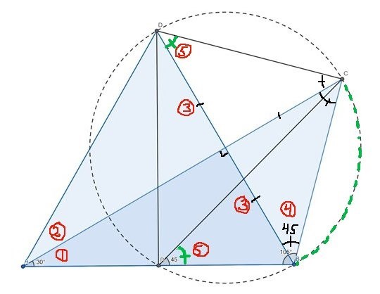 Darth Vaders lösning är intressant för att där inte utförs några räkneoperationer. Figuren utökas (liksom hos MaKe). Vinklar skrivs in en i taget tills vi har vad vi behöver (se #24, sista figuren). Men allt utgår från att vinkeln vid (1) är just 30o och inget annat. Och att vi har två lika sträckor (3) som ger kongruenta trianglar och ny vinkelinformation (5). Varefter satsen om cykliska fyrhörningar kan användas.