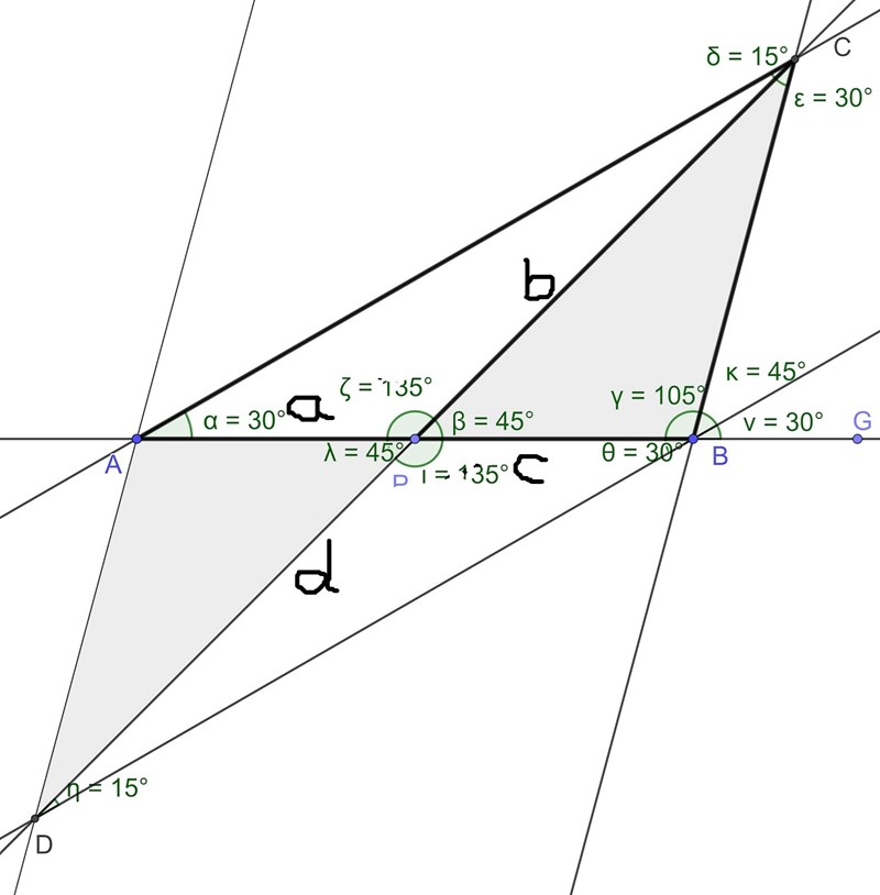 Att vi har en 30-45-105-triangel verkar lovande, eftersom 30o och 45o är trevliga vinklar.