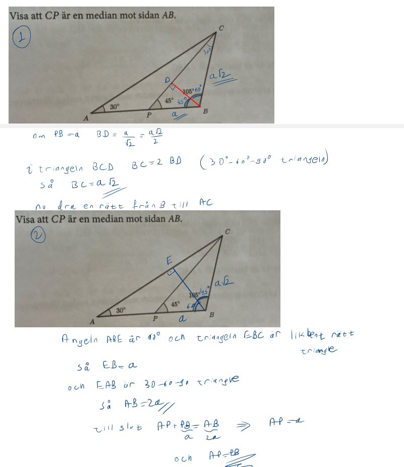 Det bör framgå varför just de givna vinklarna leder till att PC är en median (eller att P och P' sammanfaller), medan andra vinklar inte gör det.
