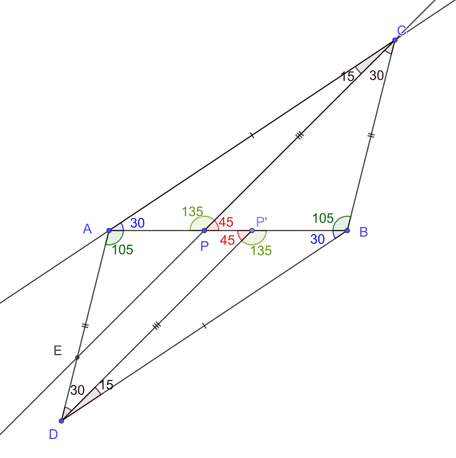 Vi kan också titta på triangeln DBP' med vinklarna 15, 30 och 135. Titta nu på linjerna PC, CA och AD. Vinklarna är 15, 135 och 30 - tillsammans 180. Alltså CADP'P måste vara en triangel och det är möjligt endast om DP'PC är en rät linje och P är samma punkt som P'.