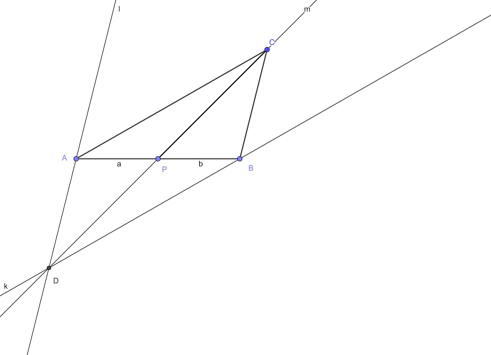Förläng CP och genom punkten B dra en linje som är parallell med AC. CP och den nya linjen skär varandra i en punkt D.