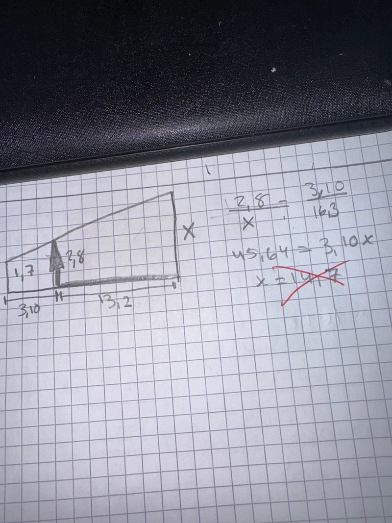 se det som att höjden växer från 1,7 till 2,8 på 3,10 sen fortsätter i samma tempo i 13,3 enheter till, för att til slut bli x