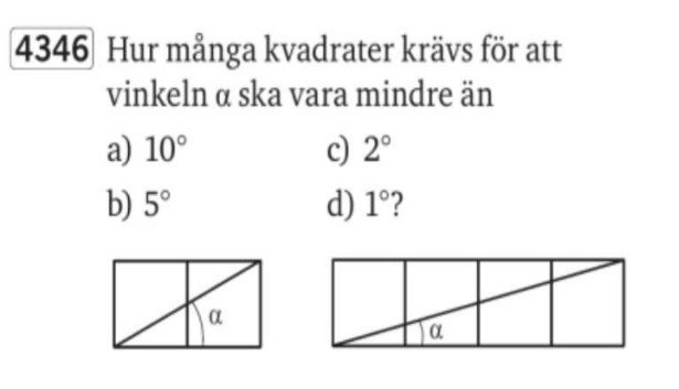 Man kan prova sig fram. Vad är arctan(1/4)? arctan(1/5)? När blir det mindre än 10 grader?