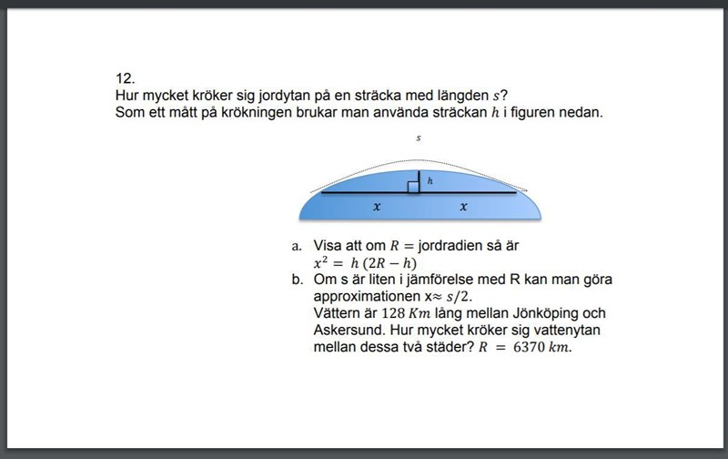 Smaragdalena skrev:Matts skrev:Taylor skrev:Börja med att rita en bättre bild som omfattar jordens centrum. Leta efter sammanhang mellan R,x,h (strunta i "s" i början).