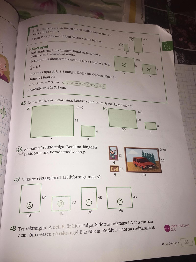 lamayo skrev:Likformighet innebär att man delar dem motstående sidorna med varandra i två figurer. Förhållandet (kvoten) ska bli samma mellan sidorna.