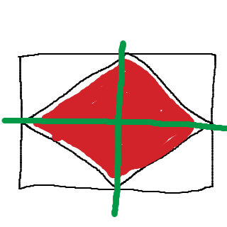 Höjden i figuren (8) multiplicerat med längden (12), dividerat med två ger figurens area, det är korrekt. Tänk dig att du delar av figuren längs den längre diagonalen (12). Då får du två trianglar med basen 12 och höjden 4. Arean blir då , vilket är samma sak som tidigare. Du kan också titta på hur stor andel av rektangeln som utgörs av romben: