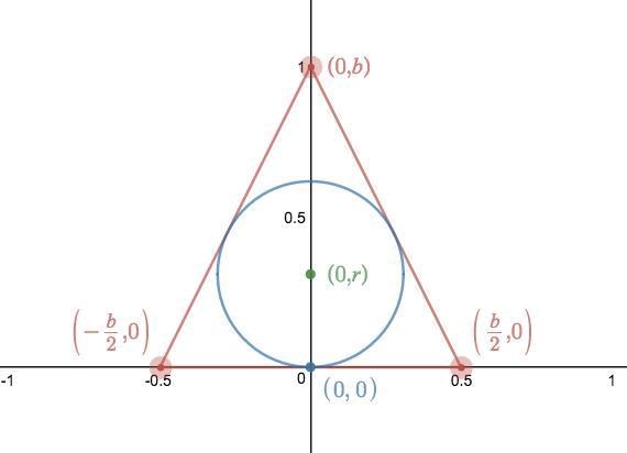 Där bb är längden på basen av pyramiden och rr är radien på den sfäriska gravkammaren. Vi behöver ta reda på ett uttryck för rr så att cirkeln tangerar punkten (0,0)(0,0) och den högra linjen (eftersom figuren är symmetrisk innebär detta att cirkeln även tangerar den vänstra linjen samt de andra två sidorna i pyramiden).