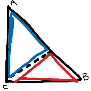 (Där M är punkten på AB som förbinder den streckade linjen med hörnet C) Kalla AM för x, hur lång är sträckan BM? Vad händer om du uttrycker CB och AC med hjälp av Pythagoras sats?