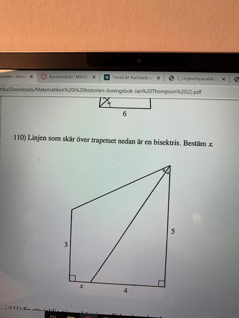 Hej någon som kan ge mig något tips på denna uppgift, har försökt länge men inte kommit någonstans. Har förlängd sidorna och fått en topptriangel samt försökt använda såväl bisektrisatsen och likformighet.