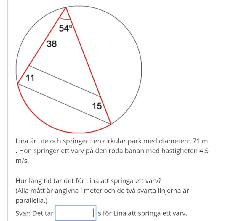 Nu vet du sträckan längs triangelns röda sidor genom att lägga ihop sträckorna. Hur räknar du ut längden på cirkelbågen?