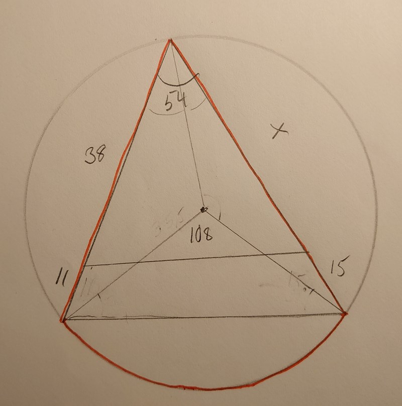 Vi har inte använt de 54 graderna ännu. Sätt in en medelpunkt och rita en linje till ena änden av cirkelbågen och en linje till den andra. Vad blir vinkeln i medelpunkten.