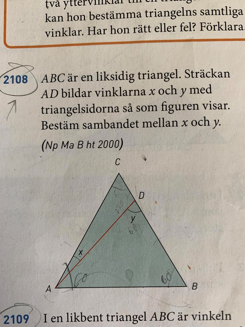 Du måste utnyttja båda trianglarna ACD och ADB. Vinkeln vid D är 180 -y. Vad är den andra vinkeln vid A ?