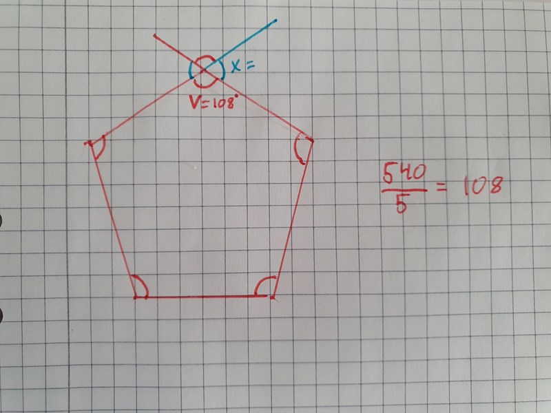 Jo men varför är den informationen relevant? Trodde det bara var 900-360=540 och man var klar där liksom. Varför måste man dela 540 på fem för att det finns fem sidor i en Pentagon?