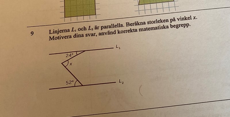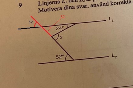 Nu bildas har det bildats en triangel med vinklarna 52 och 24, kan du räkna ut den tredje?
