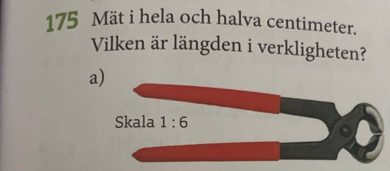 1:6 betyder helt enkelt att 1cm på bilden motsvarar 6cm i verkligheten, hur lång är verktyget på bilden? Hur långt i verkligheten är den om det för varje 1 cm motsvarar 6cm i verkligheten?