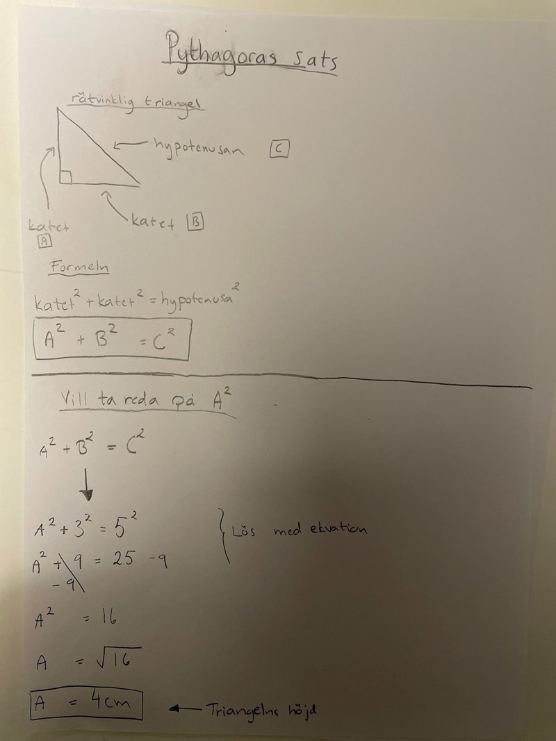 Jag löser nedan ut vad triangelns höjd är, om du ej vill veta det: kolla var högst upp på bilden där själva Pythagoras sats är kort förklarad.