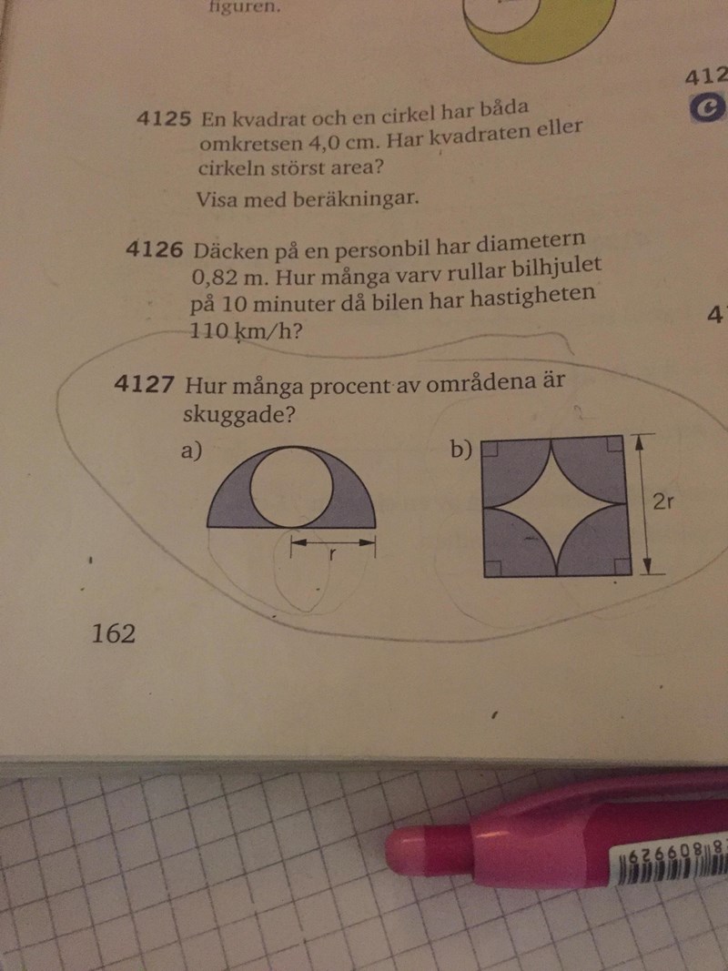 Smutstvätt skrev :wihooo123 skrev :Eftersom det finns 4 fjärdedels cirklar så utgör ju dem tillsammans en hel cirkel. Är det korrekt om jag räknar ut arean på den cirkeln och sedan jämför den med arean på hela figuren? ( delen / det hela)