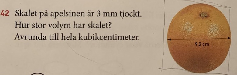Sedan subtraherar man 407,5 - 332,9 = svaret på apelsinens skals volym