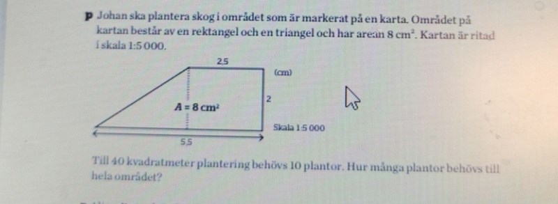 Jag har fastnat på den hära uppgiften. Det jag har kommit fram till är att 1cm på pappret är 5000 cm i verkligheten. Kan någon hjälpa mig att komma vidare sitter verkligen fast.