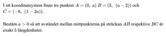 Jag har tagit reda på att mittpunkten på sträckan AB är (2,5;a-1) och på BC (-0,5;-s/2-0,5).