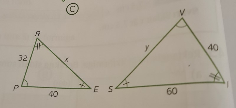 Sidorna som är motstående dessa sidor (dvs x och 60) för hållersig till varandra på samma sätt som sidorna som är motstående vinklar med 1 streck i sig. De vinklarna är PER och VSI och sidorna är 32 respektive 40
