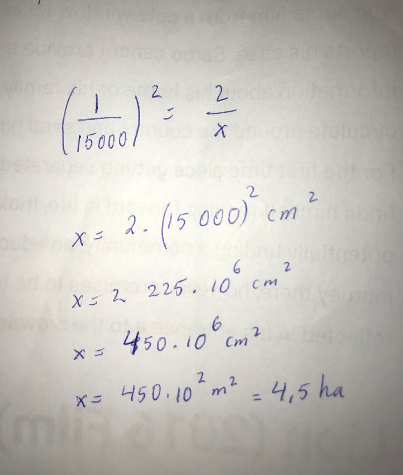 eftersom det är en förminskning tog jag 15 000 * 2 = 30 000 cm2. Sedan omvandlade jag det till meter genom att dividera det med 100, då fick jag 300. Slutligen dividerade jag 300 med 10 000 för att få fram hur mycket det blir i hektar, då fick jag svaret 0,03 hektar. Men det stämmer inte … Vad gjorde jag för fel?