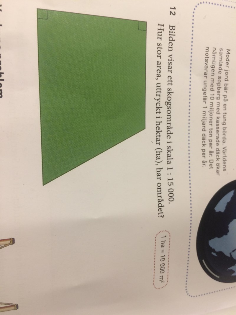 Har fastnat på denna fråga! Jag beräknade arean med att göra denna figur till en parallelltrapets där jag sedan delade arean med två. Mitt svar blev 20cm. Jag multiplicerade sedan 20 med 15 000 och fick 30 000 cm vilket motsvarar 300m. För att omvandla m till ha delade jag 300/10000 = 0.03ha. Svaret i facit är 45 ha. Måtten på denna figur är b1 (övre) = 4cm , b2 (nedre) = 6cm och höjden är 4cm.