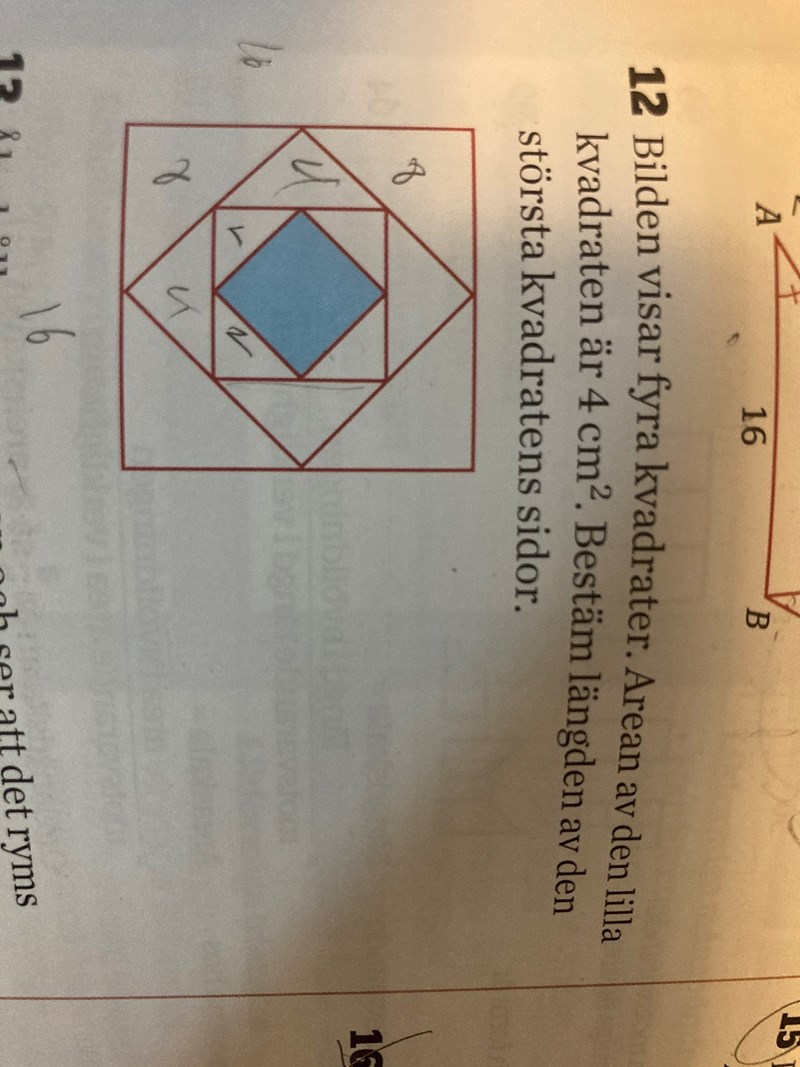 Varje kvadrat har ju dubbelt så stor yta som den närmast innanför (hur vet vi det?) och när du vet ytan på den yttersta är det ju rakt fram att räkna ut sidan.