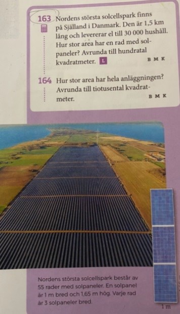 1500/1 eftersom varje "paket" av 3 paneler är 1m i solparkens längdriktning.b) Det finns 55 rader. Om varje rad är 7425 m2 kan hela arean beräknas. Man använder det icke-avrundade värdet när man räknar och rundar av på slutet.